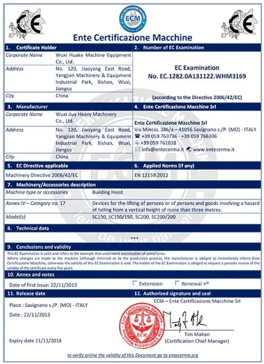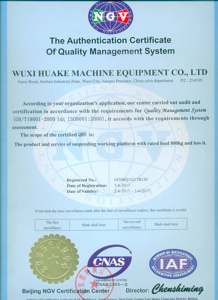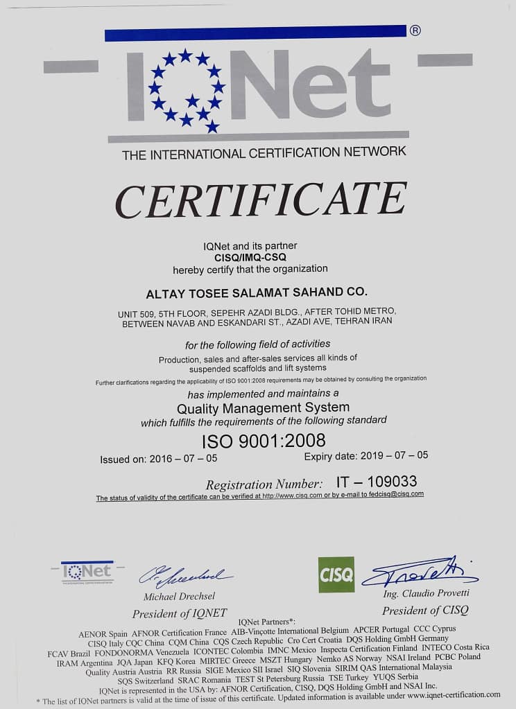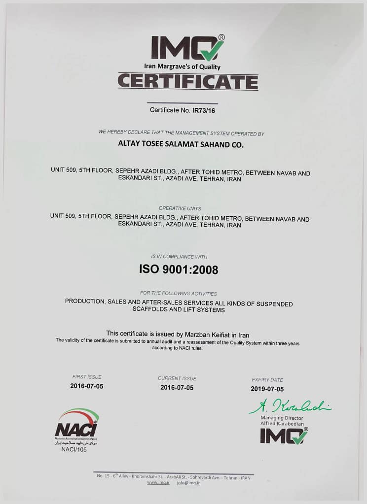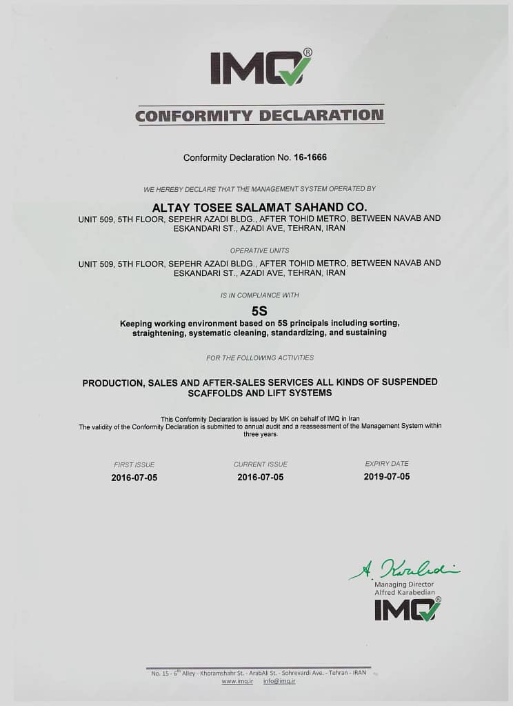سیستم داربست معلق (suspended scaffol) که در ایران بنام کلایمر شناخته شده است که دارای استانداردهای بین المللی است. و الزامات مختلف در طراحی و ساخت بخش های متعدد کلایمرها می باشد. از جمله این الزامات دریافت استاندارد EN 1808، استاندارد CE اروپا، گواهی نامه های بازرسی کیفی مانند گواهی نامه های SGS می باشد. به دلیل حساسیت کاری بسیار بالای عملکرد این دستگاهها و قرار گیری نفر در داخل این دستگاه، رعایت این استانداردها در تولید محصولات کلایمر از اهمیت بسیار بالایی برخوردار است. لازم به توضیح است که کلایمرهای ارائه شده توسط این شرکت به صورت پکیج کامل وارداتی بوده و از برندهای معتبر بین المللی تهیه شده است و شرکت های سازنده آن استانداردهای بین المللی را دریافت کرده اند که در ادامه نمونه ای از این گواهی نامه ها نمایش داده می شود.